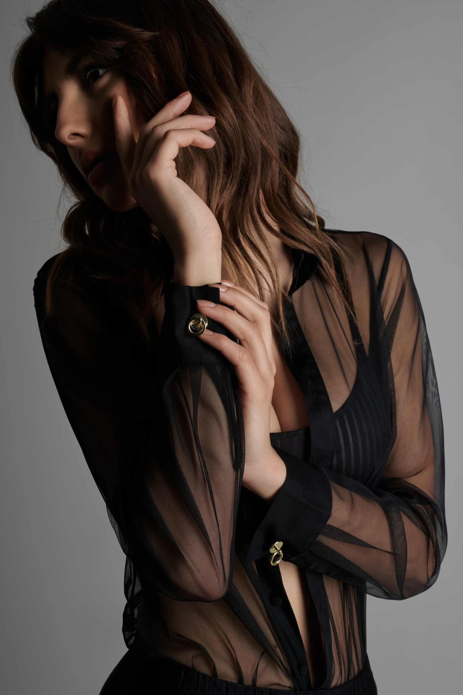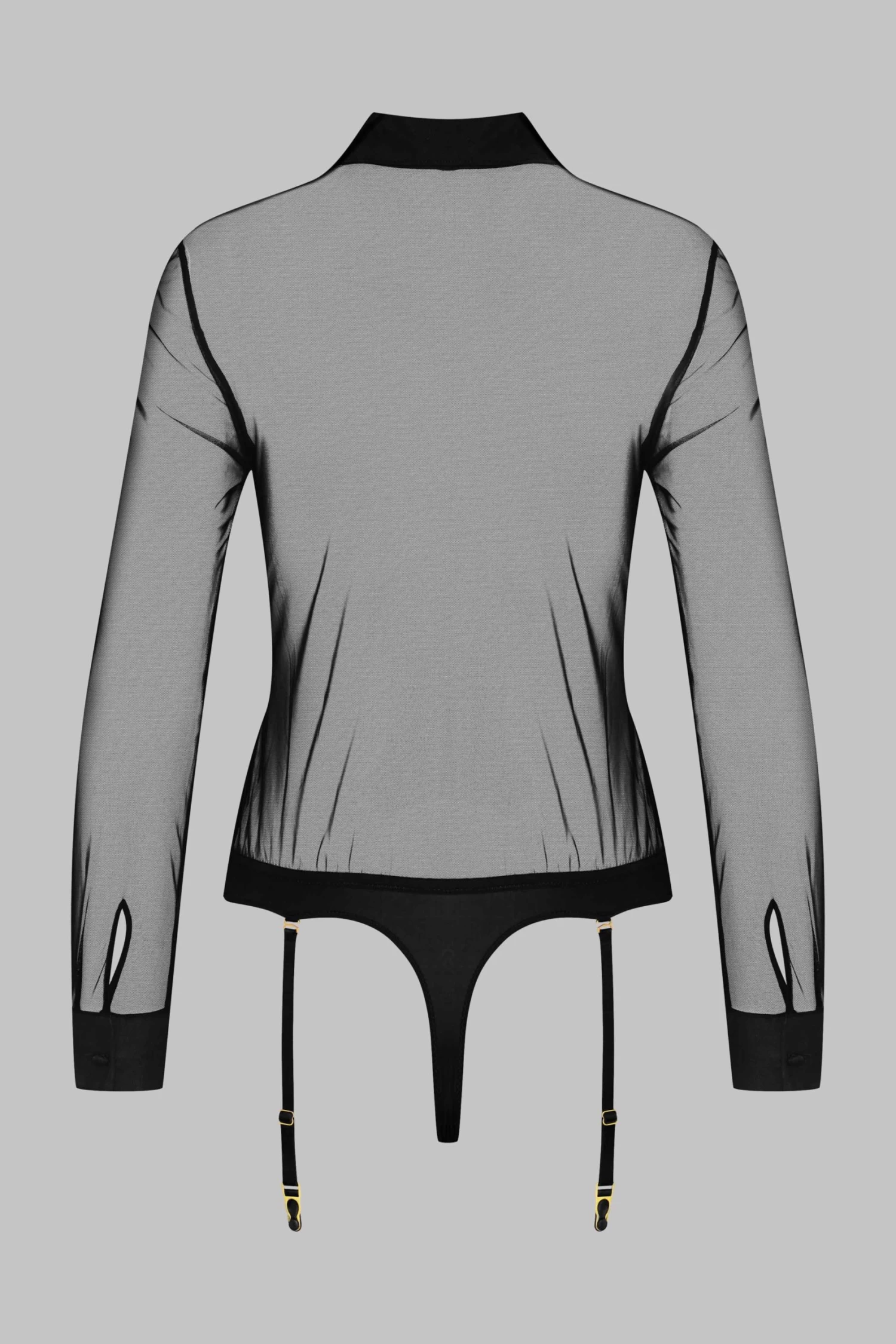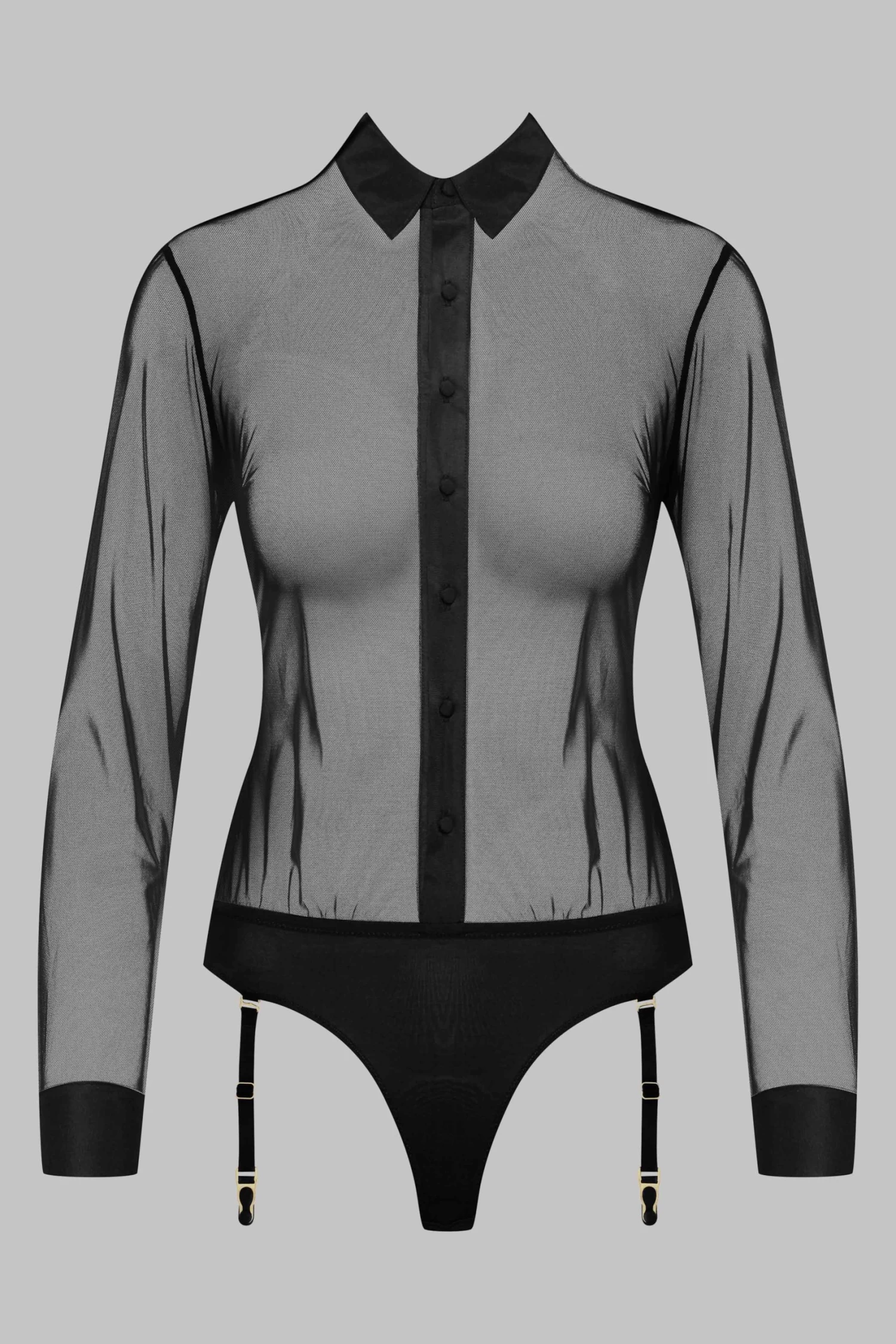 Body en tulle et microfibre. Chemise entièrement transparente fermée à l’avant par des boutons recouverts de tulle. Bas string en microfibre. Poignets et col en double épaisseur de tulle.