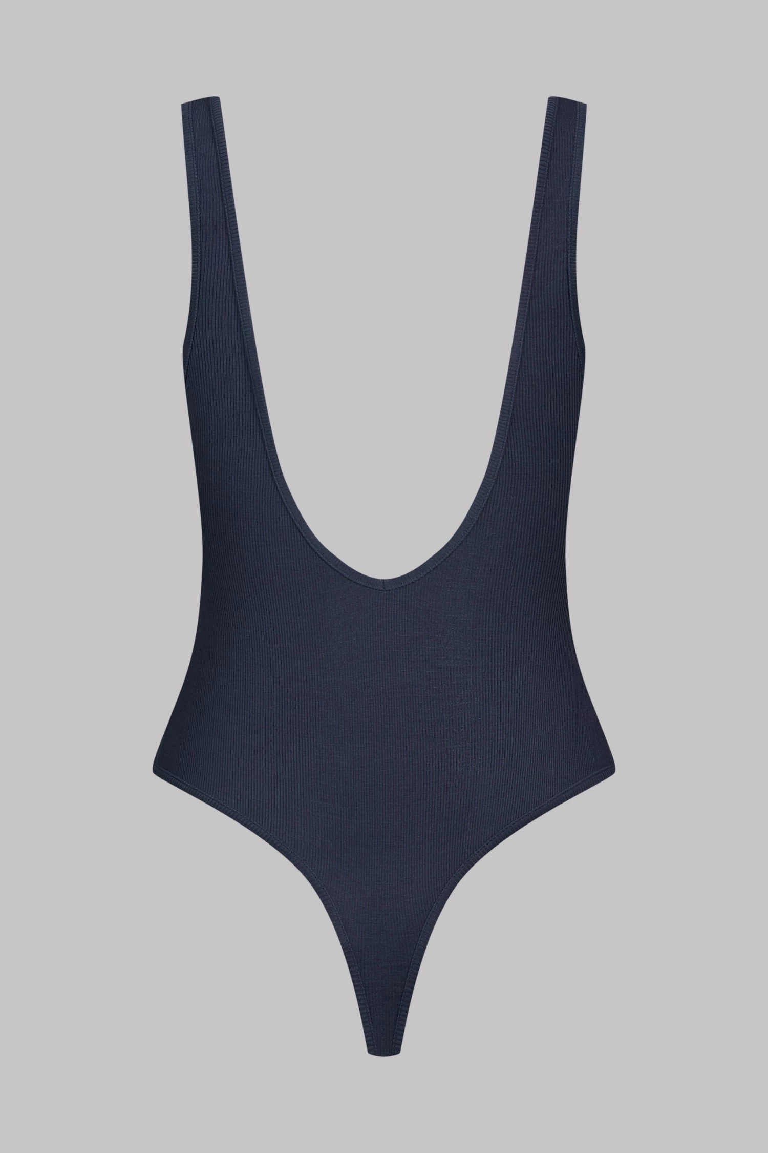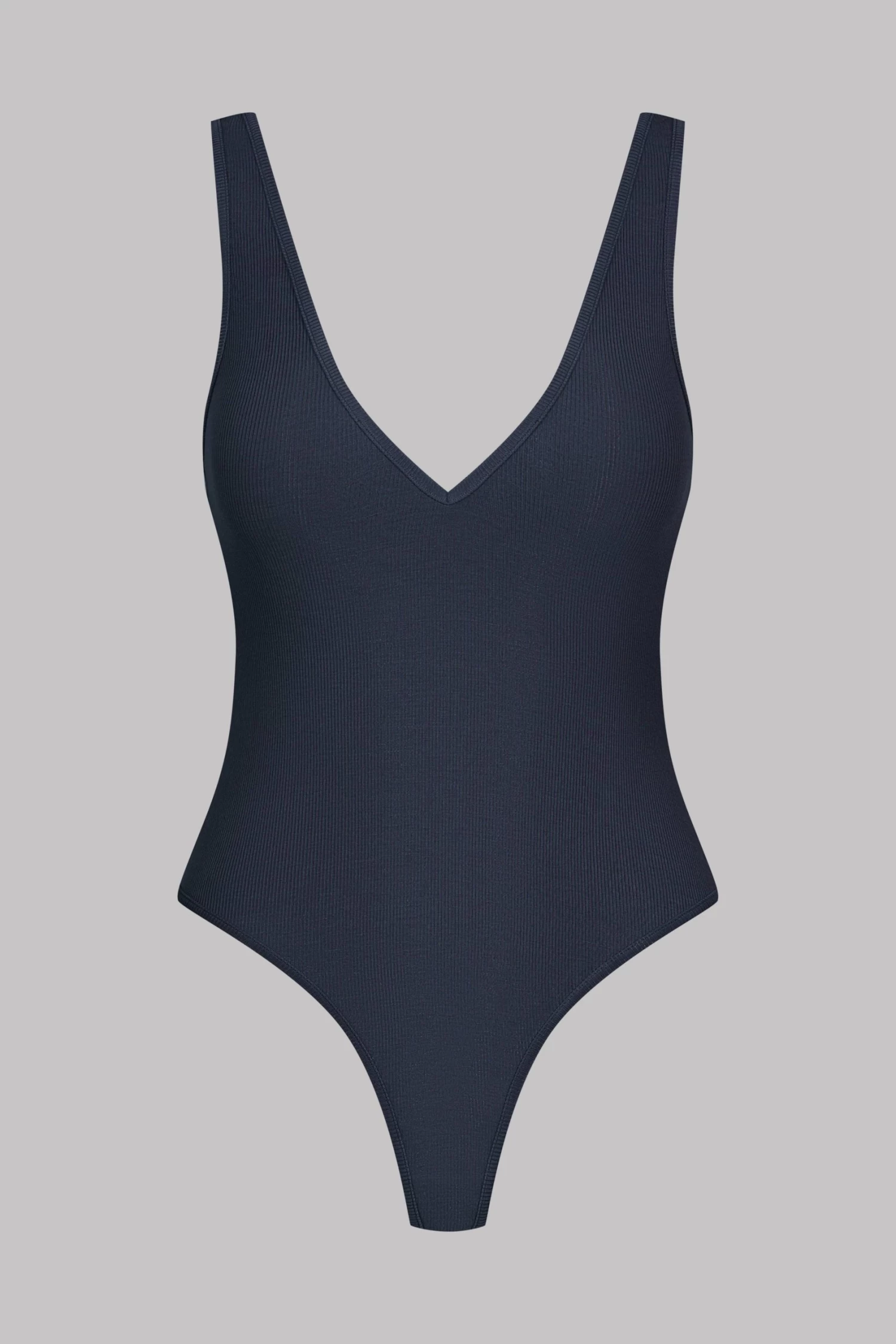 Body string col V et décolleté dans le dos. Modal côtelé ultra extensible, doux et léger qui s’étire en brillance comme en transparence. Coupe échancrée et épurée au toucher unique. Ouverture par agrafes réglables à l’entrejambe. Jouez avec le positionnement des bretelles pour créer un nouveau style.