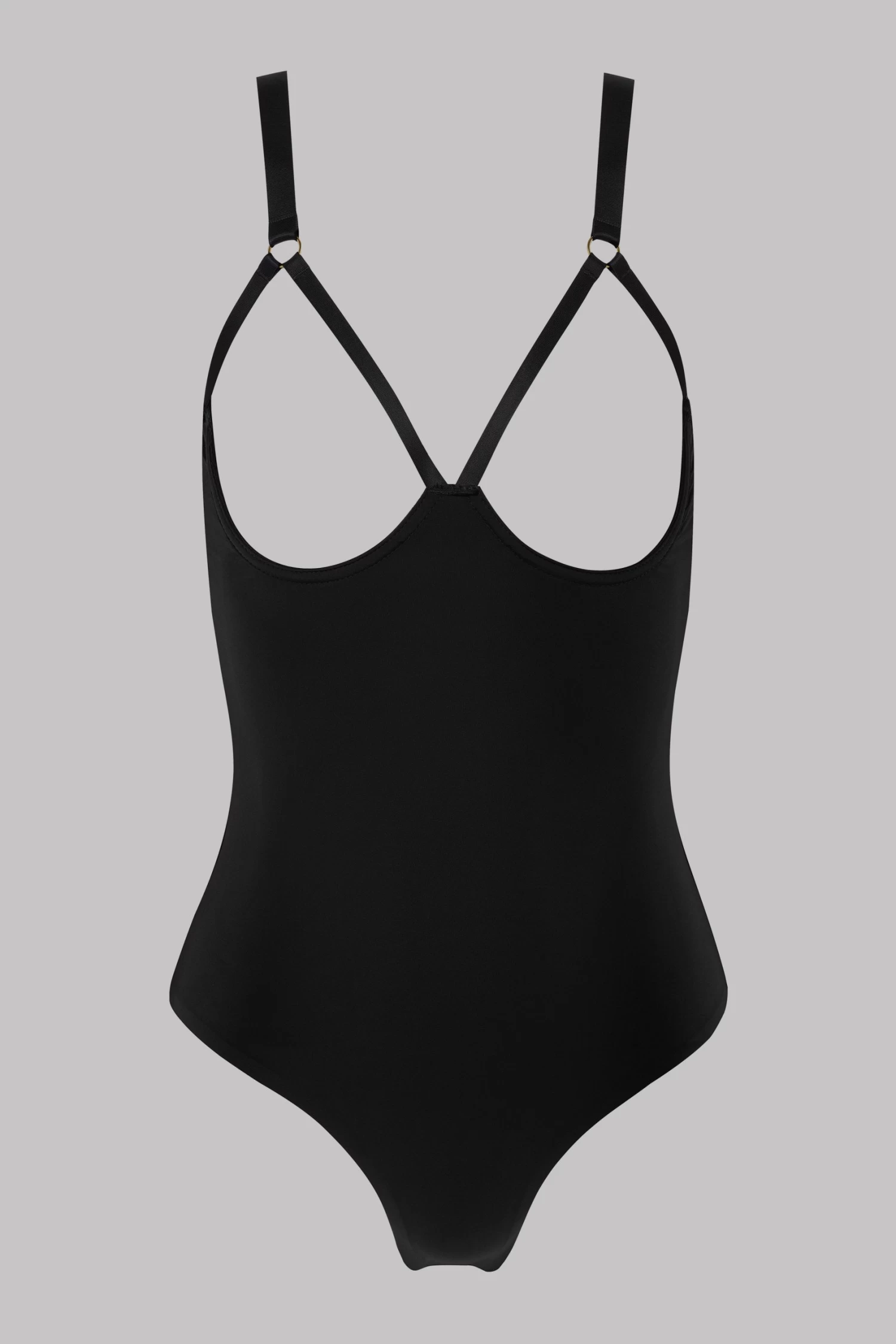 Body ouvert en microfibre opaque. Dos nu avec culotte cœur ouvrable par une accroche dorée. Ajustable au dos par un agrafage.