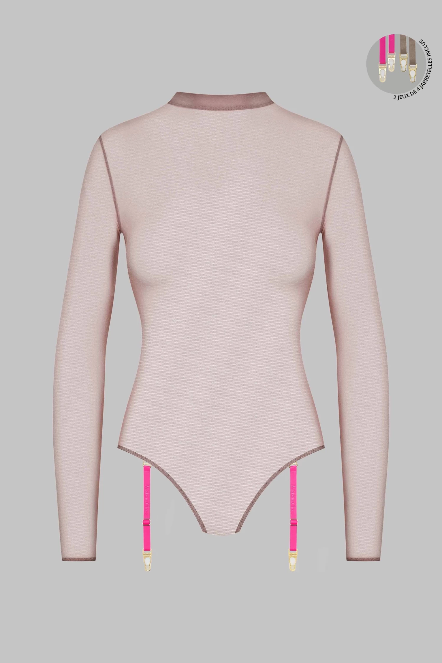 Le body Corps à Corps se démarque grâce à ses 2 jeux de jarretelles aux finitions dorées, réglables et interchangeables : 4 jarretelles assorties et 4 jarretelles rose fluo.
