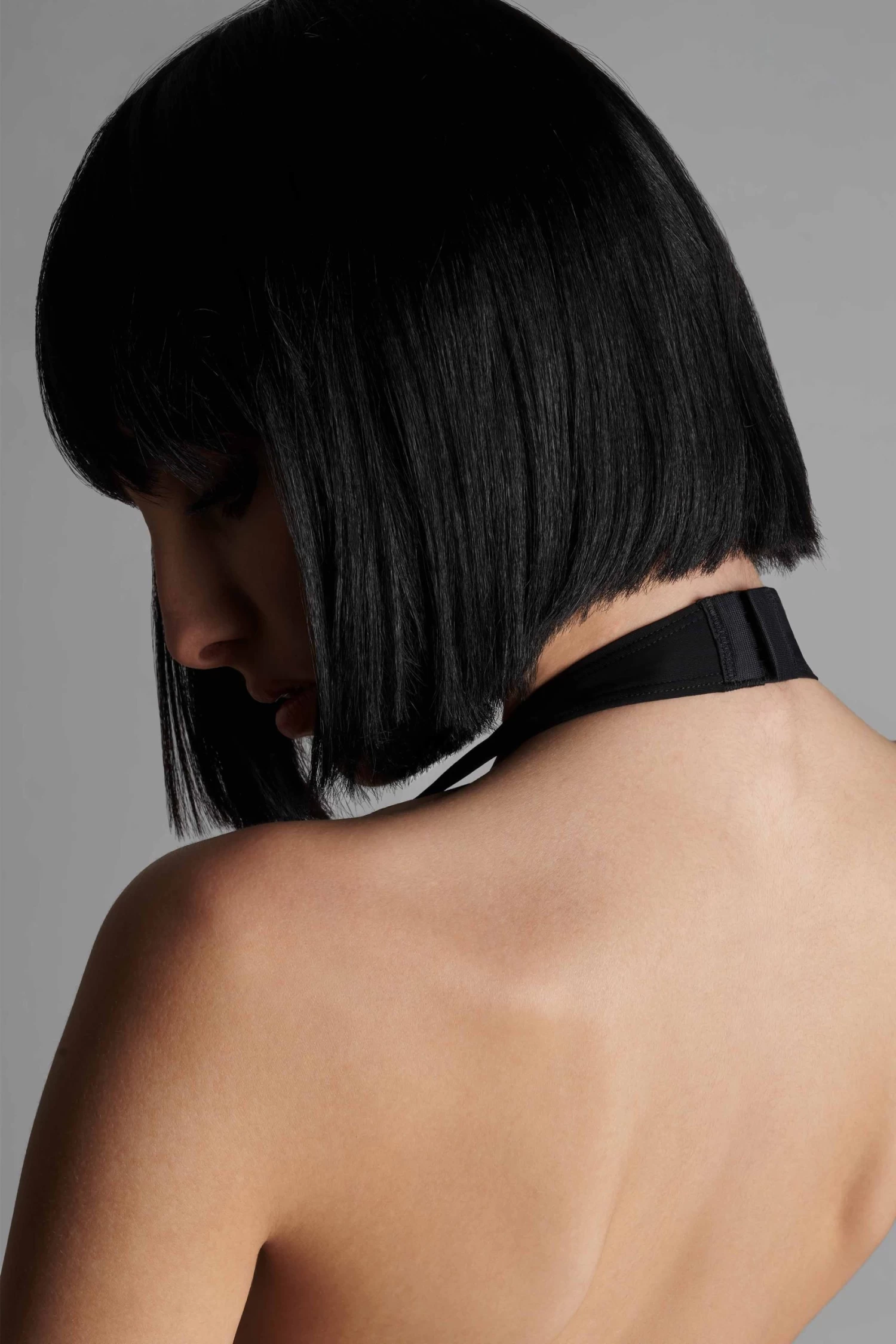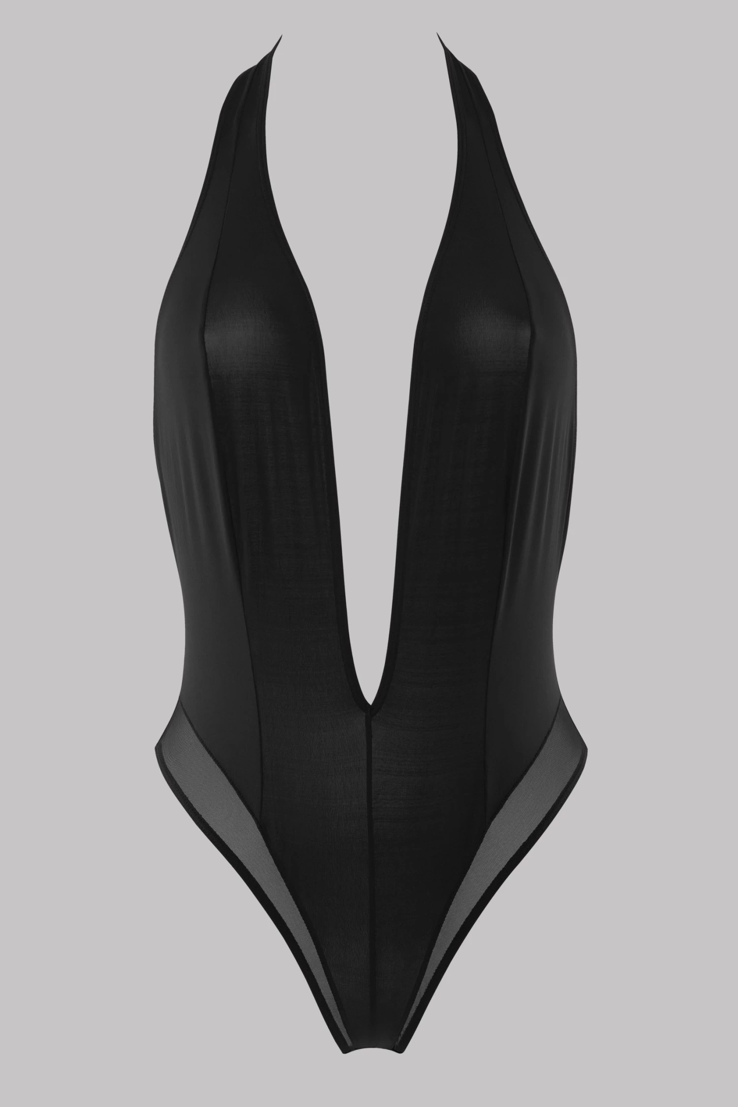 Body string dĂ©colletĂ© V profond en microfibre semi opaque devant. Dos nu jusqu’au creux des reins en tulle Ă l’arrière. Échancrure accentuĂ©e par une dĂ©coupe graphique. Fermeture dans la nuque et l’entre jambes par des agrafages rĂ©glables.