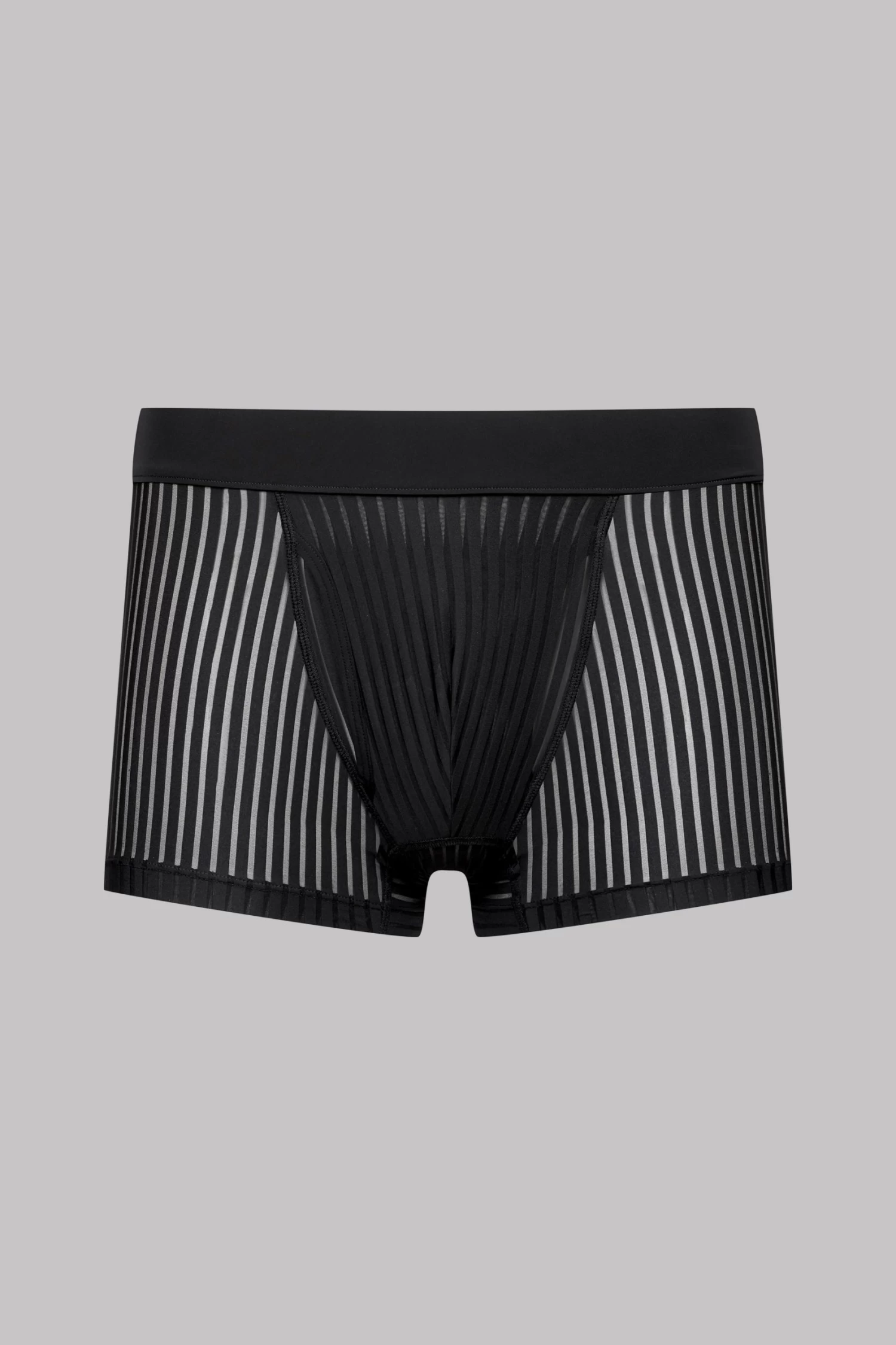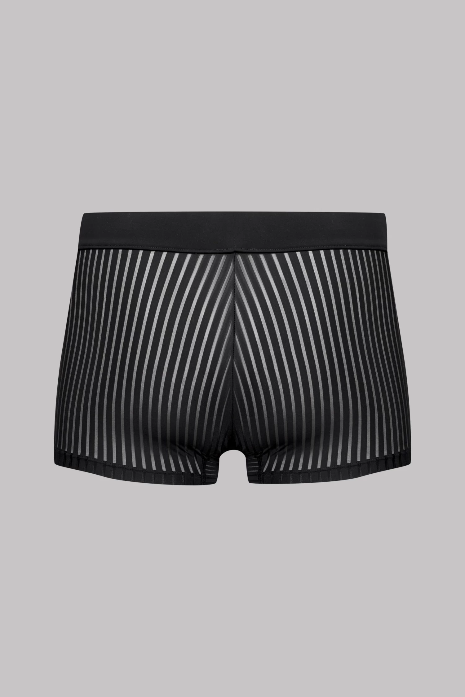 Boxer en microfibre aux rayures ajourées, transparentes et graphiques. Coupe ajustée sur les fesses et à l’entrejambe pour un bon maintien. Forme légèrement plus courte sur la cuisse qu’un boxer classique pour un confort optimal. Ceinture élastiquée recouverte de microfibre unie noire. Ouvrable sur le devant avec doublure intérieure pour plus de confort.