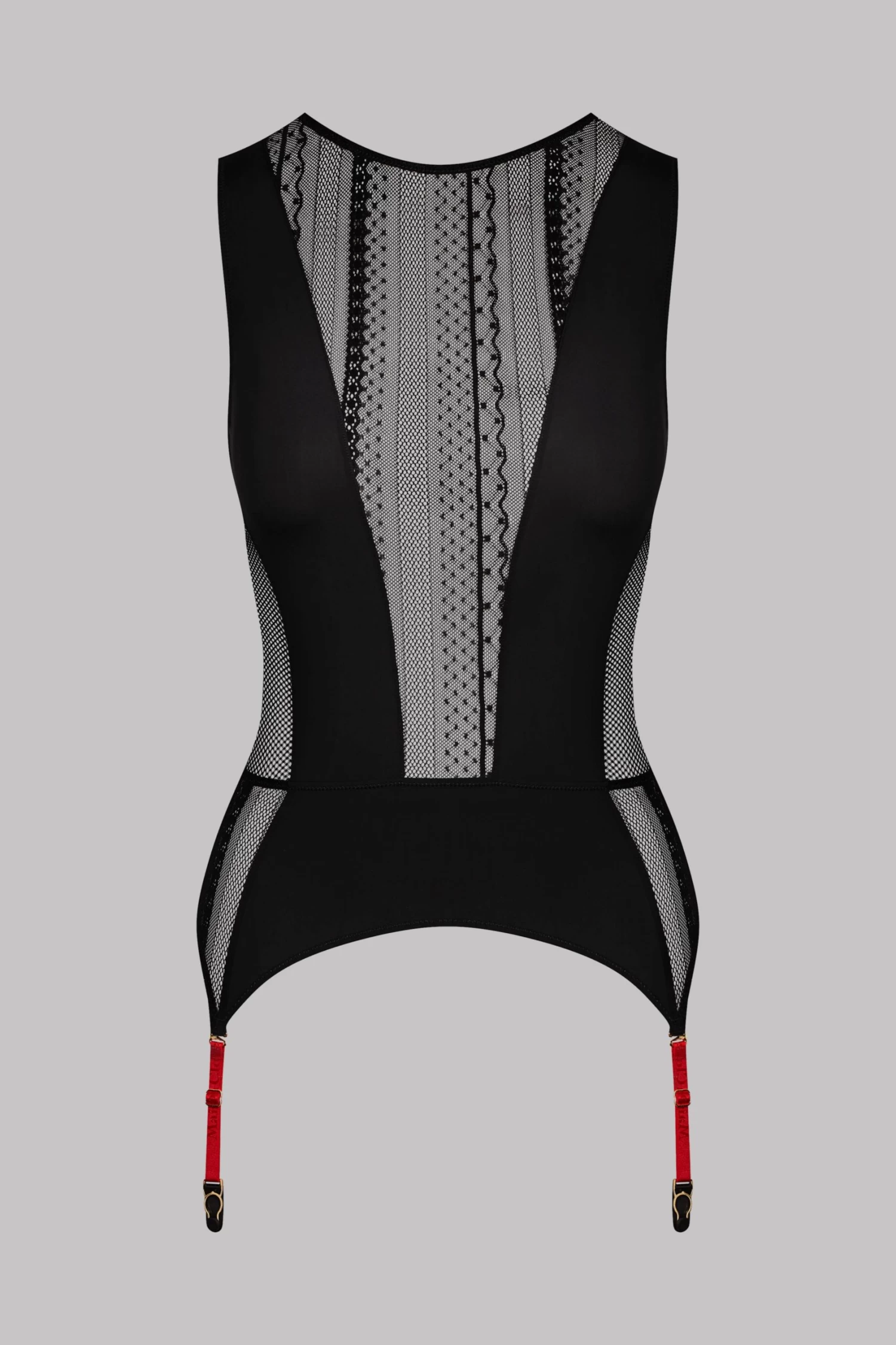 Le débardeur avec porte-jarretelles Sacré Cœur est une pièce de lingerie graphique, à l’esthétique chic et suggestive, magnifiée par le trio dentelle, résille et microfibre qui réussit à révéler la beauté de ce qu’on l’on cache.