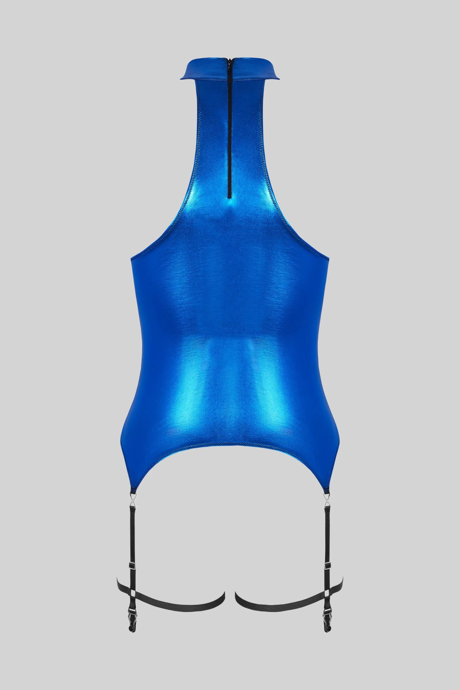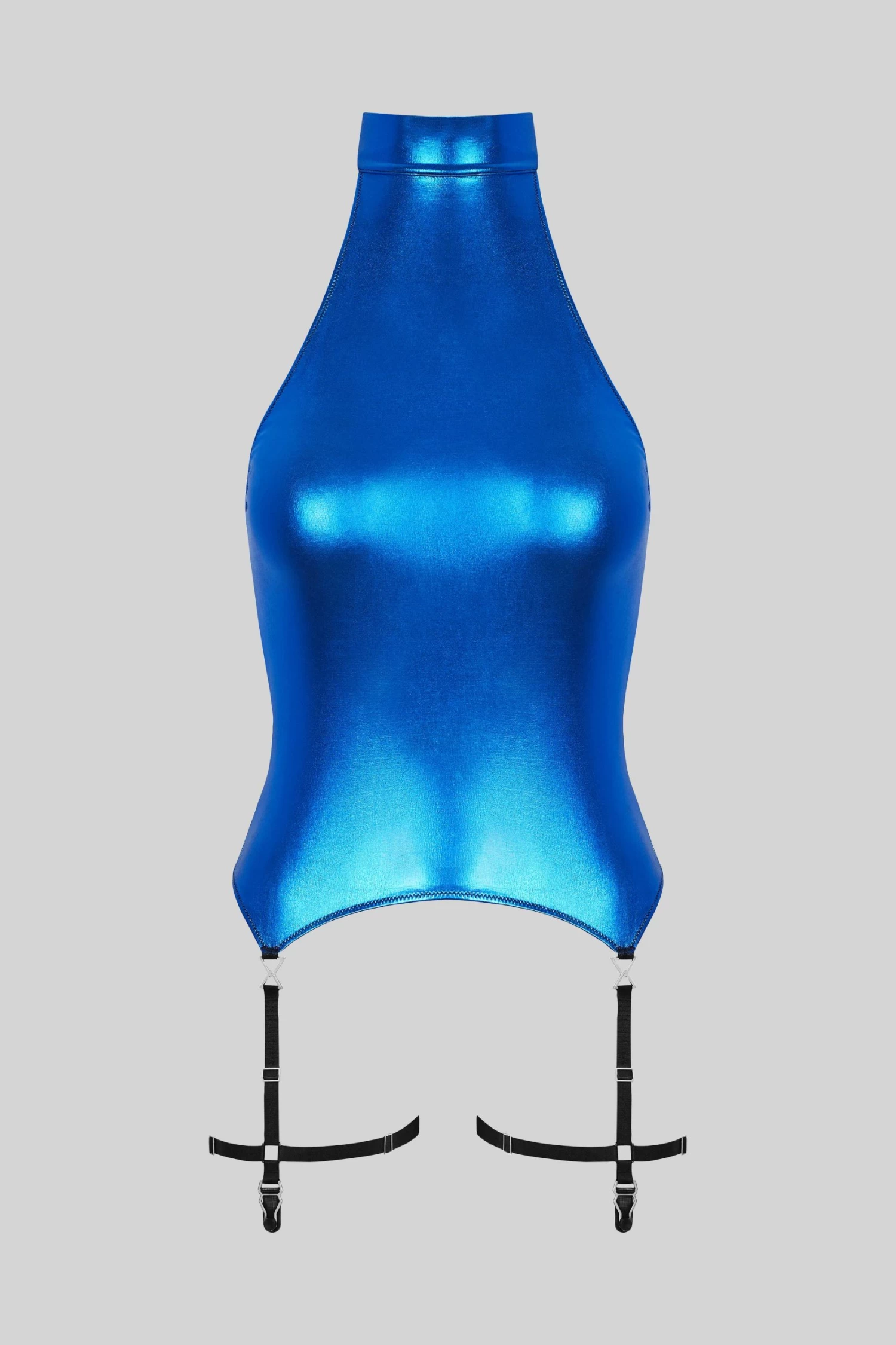 Débardeur porte-jarretelles en microfibre avec application d’un foil métallisé. Porte-jarretelles amovibles avec attaches papillon. Forme jarretière qui entoure la cuisse. Encolure américaine avec zip invisible au dos. Coupe très ajustée au niveau du buste.