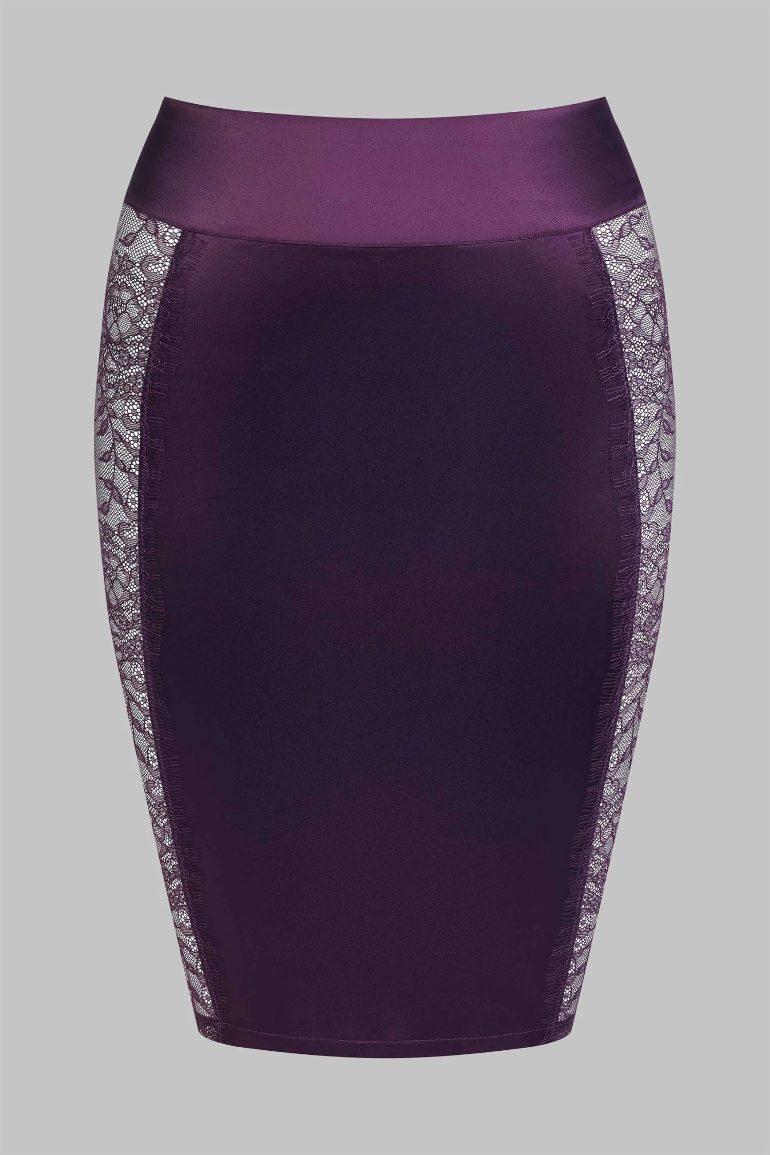 Jupe crayon en satin et fine dentelle florale. Pièce emblématique de la collection VILLA SATINE en satin sublimée par deux bandes de dentelles sur les côtés qui dessinent la silhouette. Fermeture double sens par un zip ton sur ton au dos. Ceinture conçue avec une large bande de satin pour sublimer la taille. La jupe ajustée est à porter de jour comme de nuit.