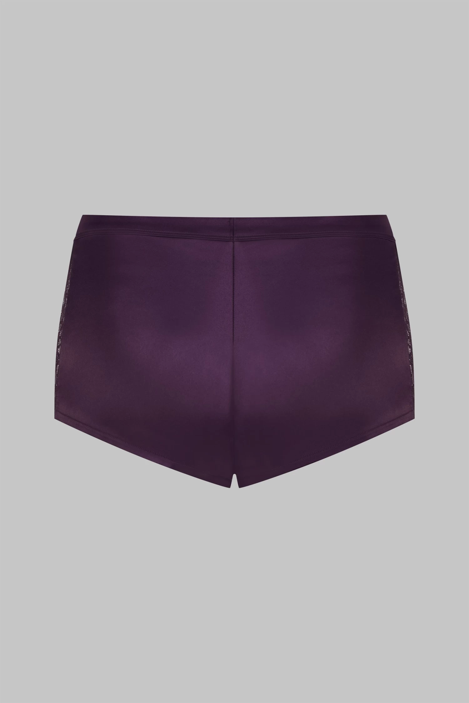 Mini short en satin et fine dentelle florale. Coupe courte rehaussée de deux bandes de fine dentelle florale sur les côtés pour dessiner les courbes. Ceinture élastique taille basse recouvert de satin.