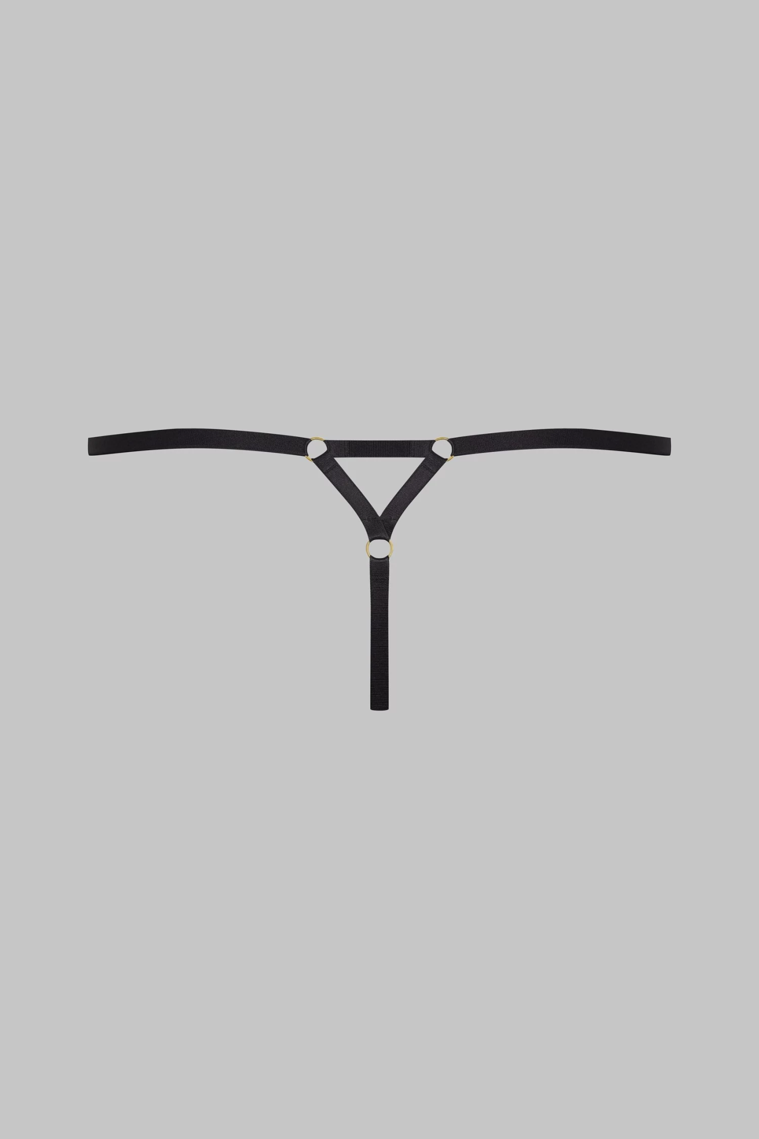 Mini string effet-cuir mat. Jeux d’anneaux dorées reliés au creux des reins par des élastiques. Signature de la collection, un anneau « féti-chic » doré orne le devant et suggère l’attachement.
