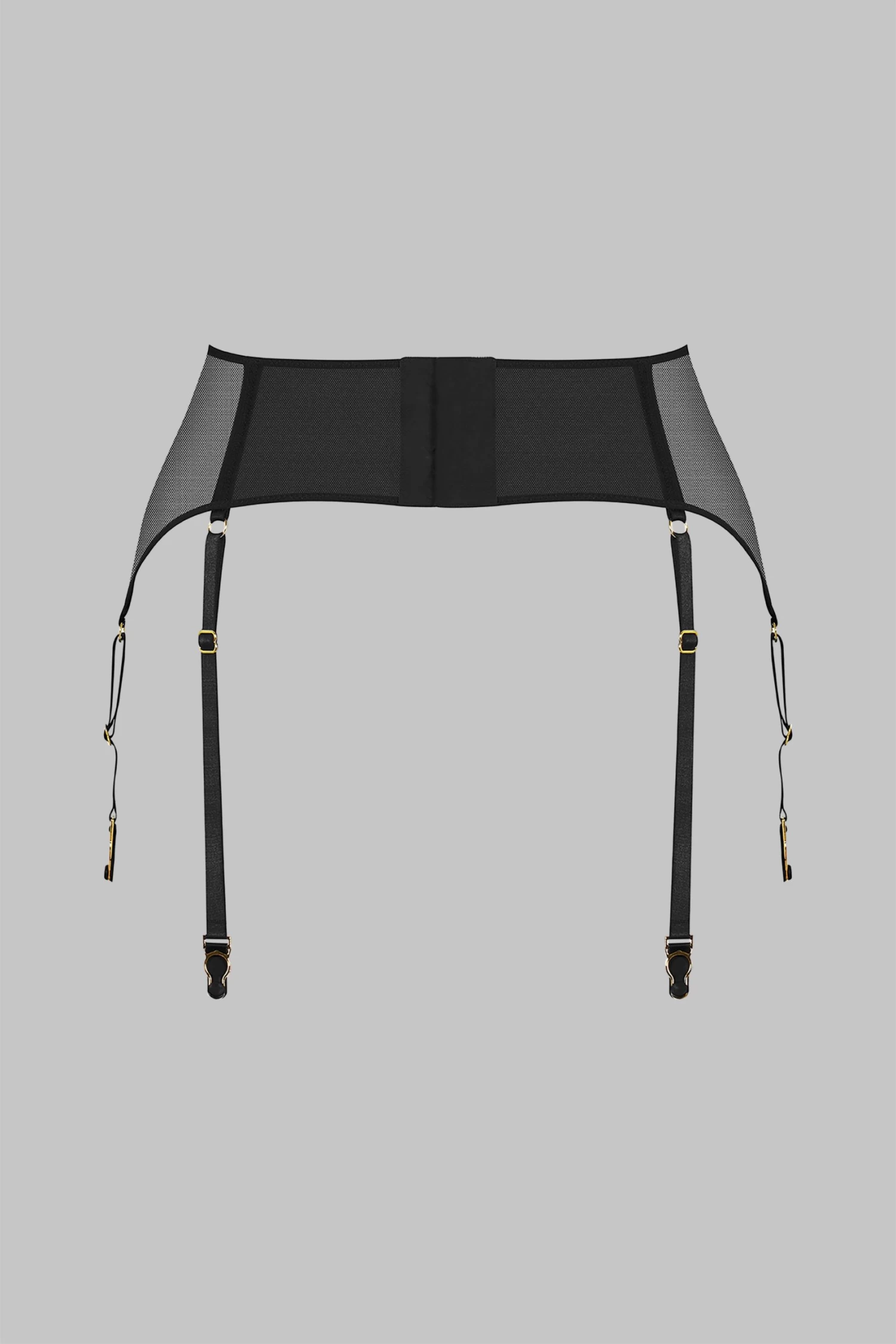 Porte-jarretelles en tulle d’une transparence absolue. Tulle creusé et doublé à l’avant pour un contraste de transparence et d’opacité. 6 jarretelles réglables et non amovibles viennent structurer le haut des jambes. Fermeture au dos par un agrafage lisse et fin.