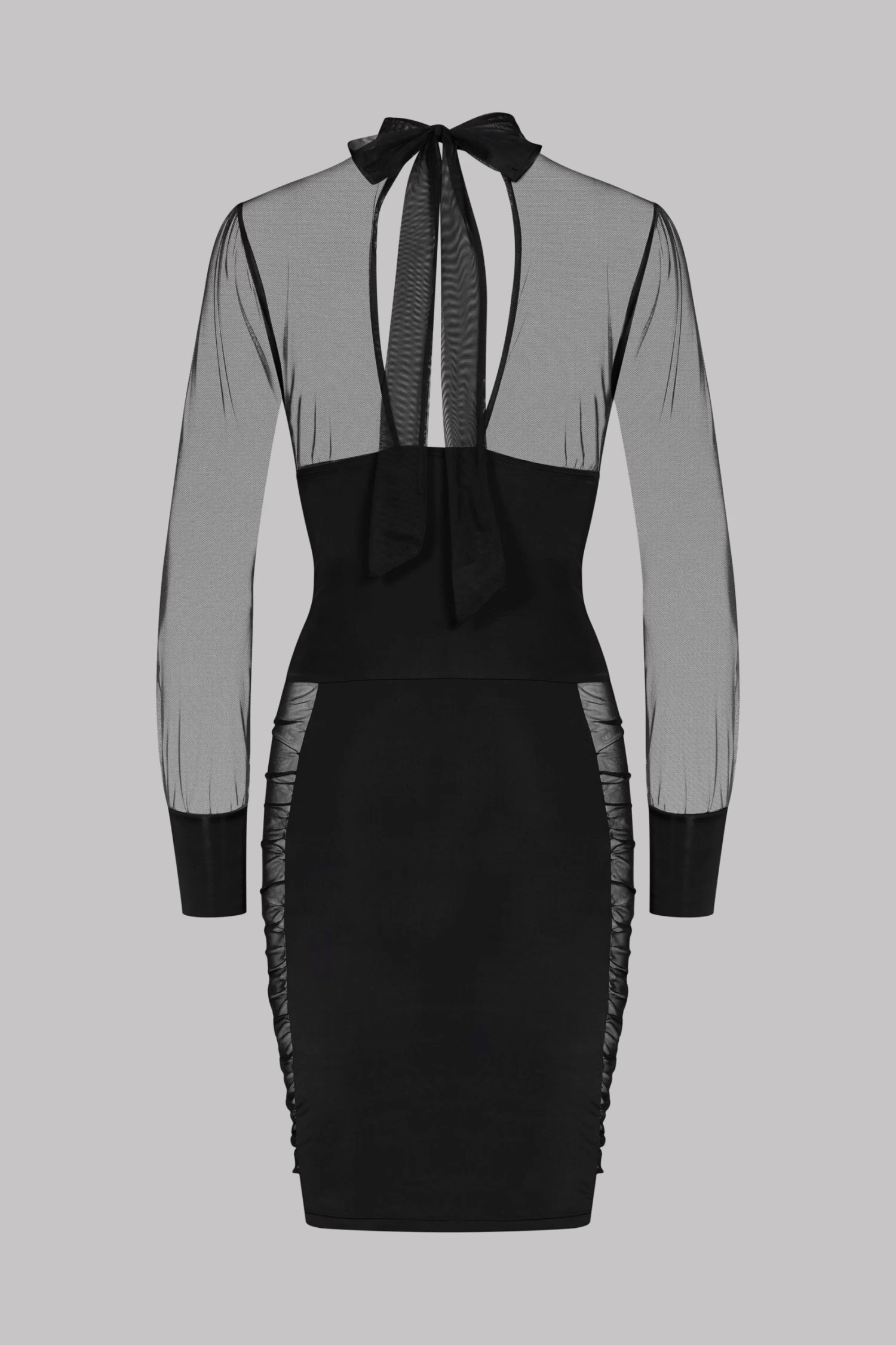 Pièce maitresse en microfibre opaque et tulle transparent, avec des manches longues vaporeuses en tulle transparent. Poignets en microfibre opaque. Tulle froncé sur les côtés.