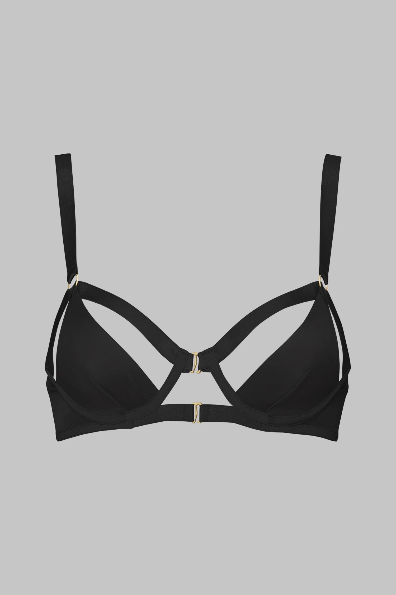 Soutien-gorge bondage en microfibre opaque. Buste harnaché d’élastiques et d’un pan en microfibre thermocollé. Ouvrable par des accroches dorées entre les seins.