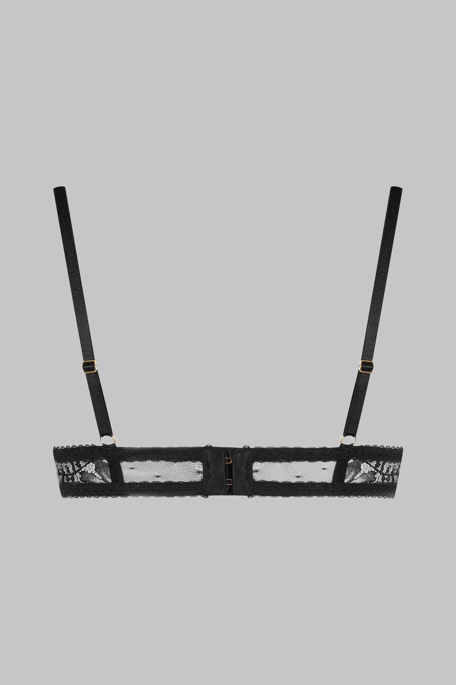 Soutien-gorge balconnet en dentelle à cils rigide avec armatures. Forme foulard en dentelle qui apporte un joli galbe, orné d’un bouton doré. Fines bretelles élastiques et réglables aux finitions dorées. Dos en tulle plumetis avec fermeture ajustable par un agrafage.