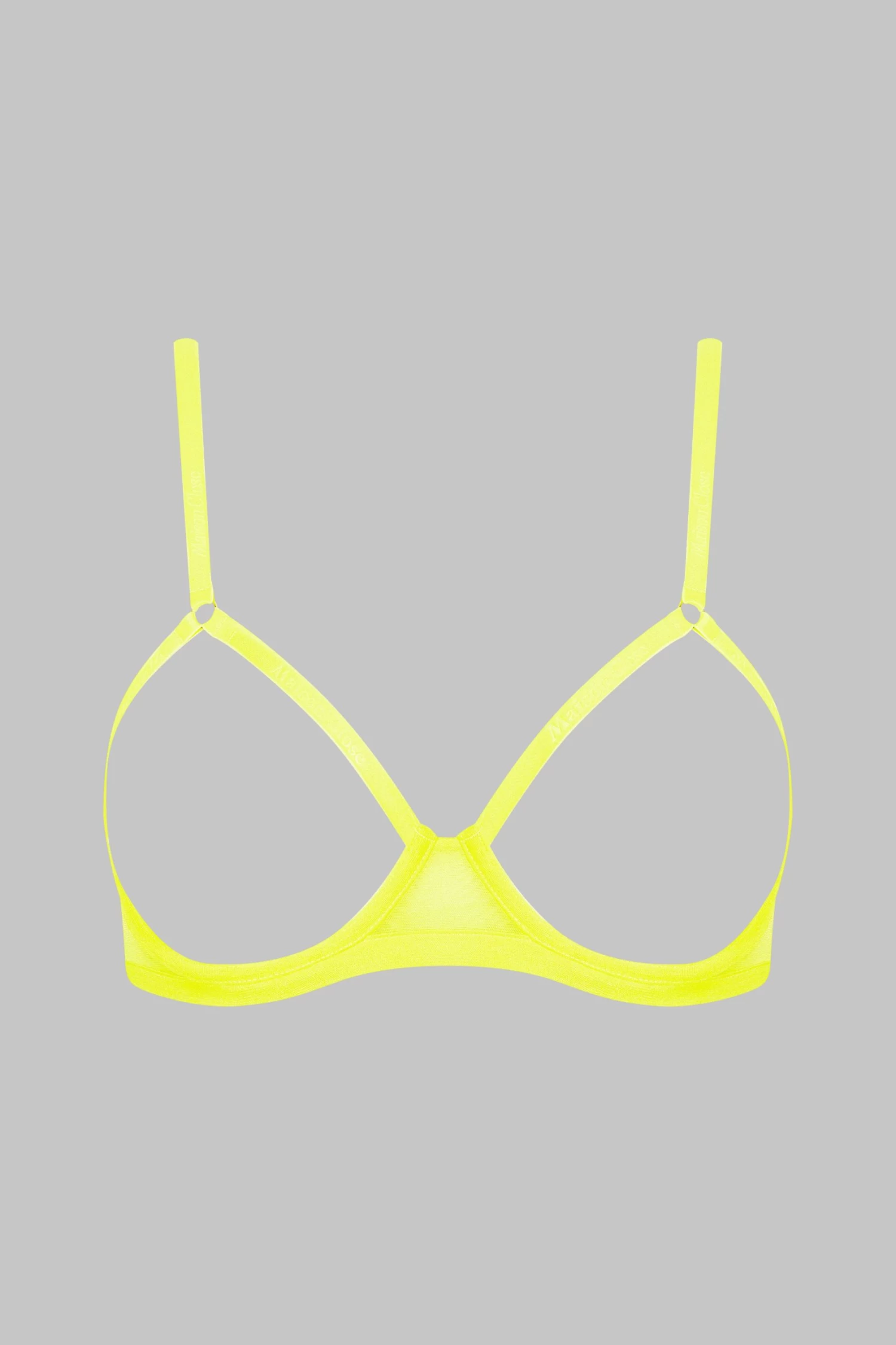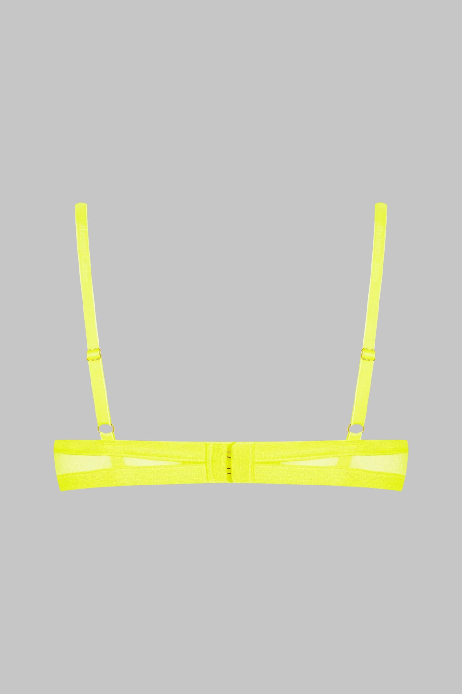 Le soutien-gorge ouvert avec armatures en tulle néon est la pièce irrévérencieuse de la collection.