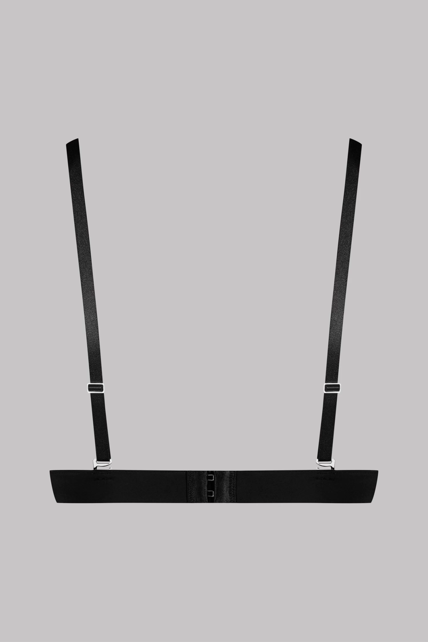 Bonnets forme triangle sans armatures. Une large bande élastique sous poitrine recouverte de microfibre unie apporte un bon maintien. Fermeture ajustable par un agrafage au dos. Bretelles élastiques, amovibles et réglables aux finitions argentées.