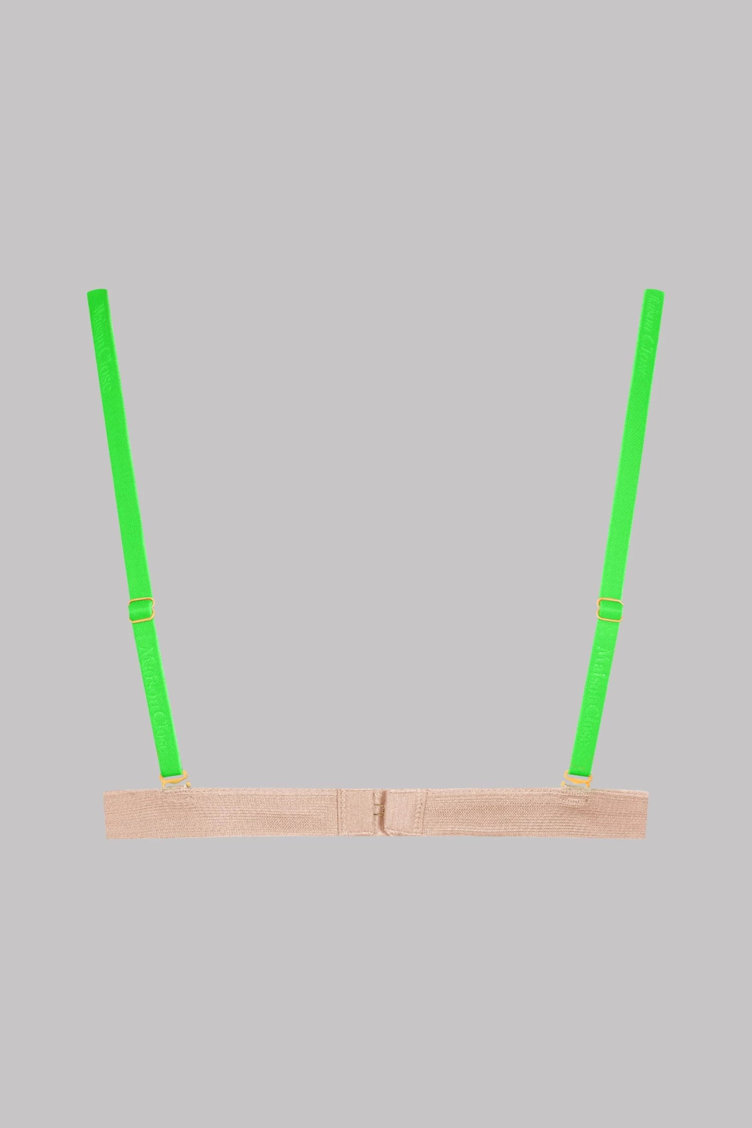 Le soutien-gorge triangle Corps à Corps est rehaussé par ses bretelles aux finitions dorées, réglables et interchangeables : une paire de bretelles assortie et une paire de bretelles vert fluo.