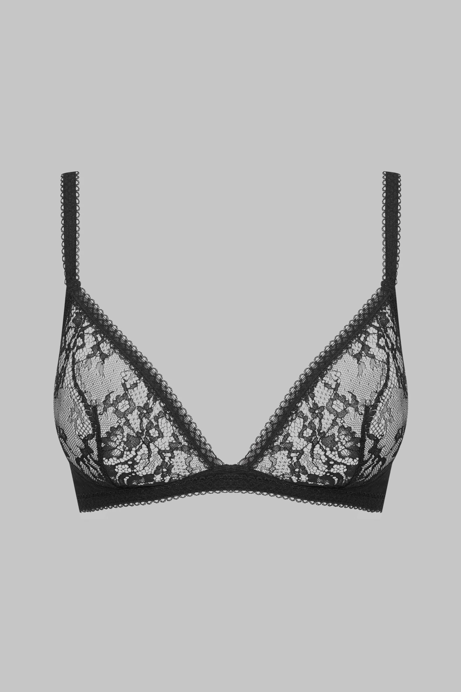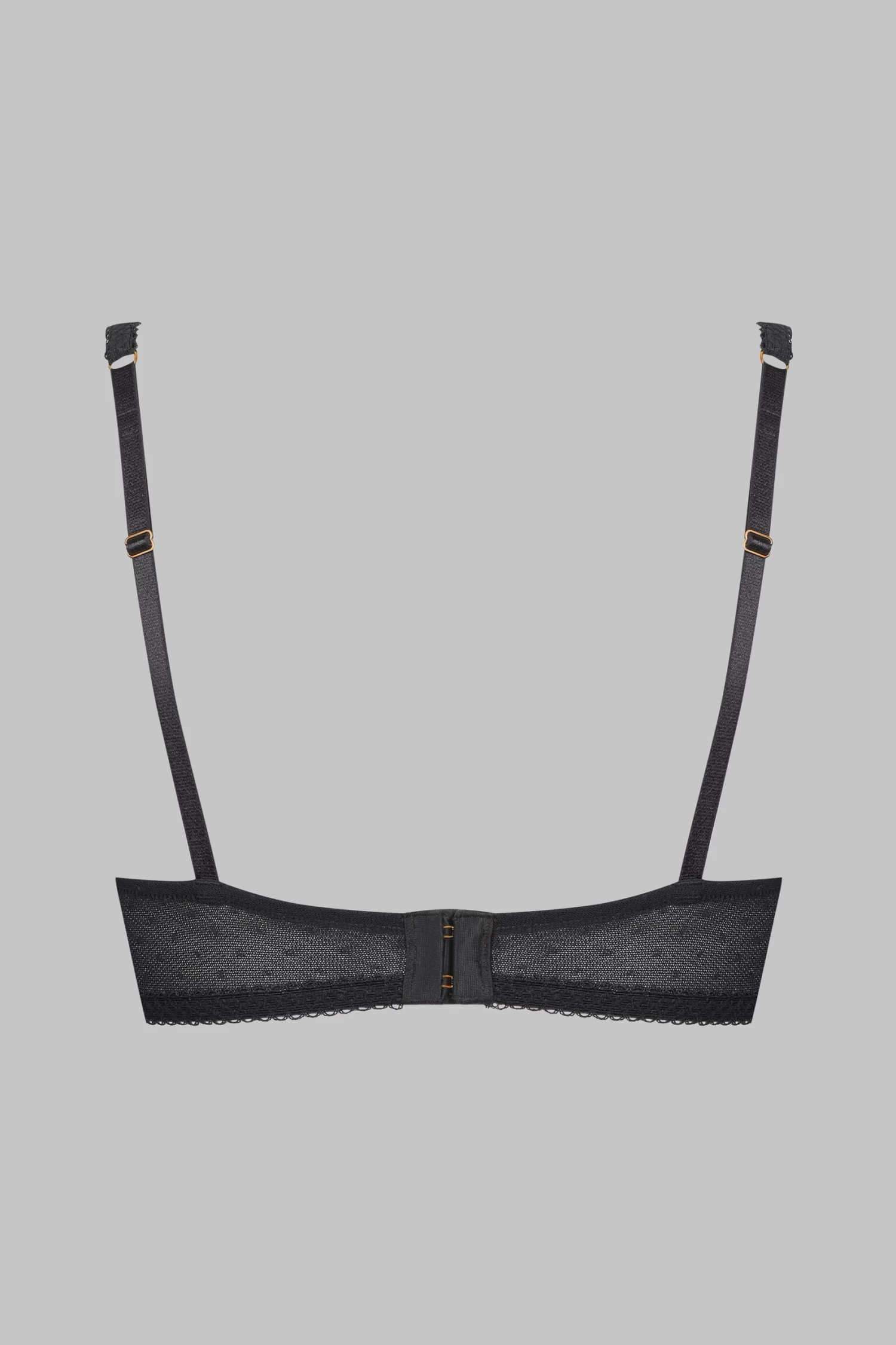 Soutien-gorge coupe triangle alliant une dentelle gothique à l’avant et un tulle plumetis doublé extensible en tour de buste. Sans armatures et avec des bretelles réglables en élastiques picots. Ouvrable et ajustable par agrafages au dos.