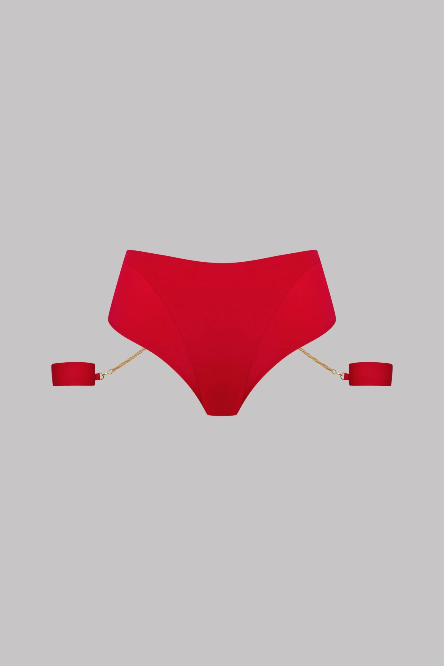 Jeu de menottes amovibles avec chaines dorées et bandes élastiques aux poignets. Les menottes s’attachent à l’anneau du string, entre elles ou selon vos envies sur tout autre pièce de la collection.